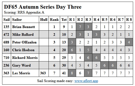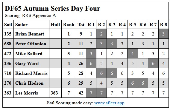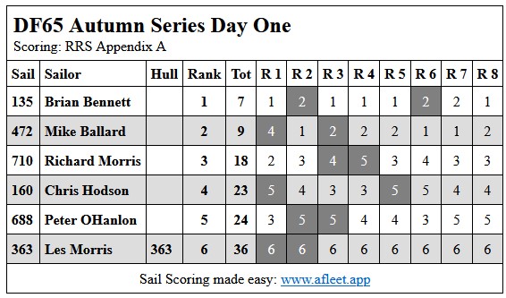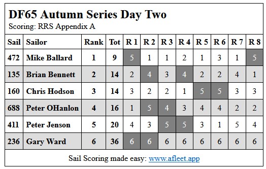 2024 DF65 Autumn series Link to trophy information Day 1, Sat 20 Apr Day 2, Sat 27 Apr Day 3, Sat 4 May Day 4, Sat 11 May Home Sailing Calendar Sailing Handicaps Club Contacts Photo Gallery