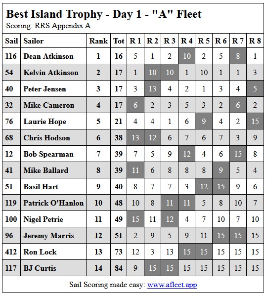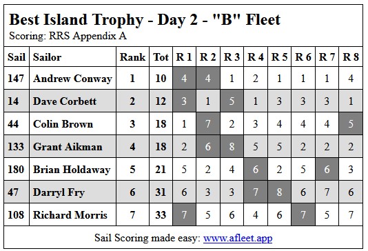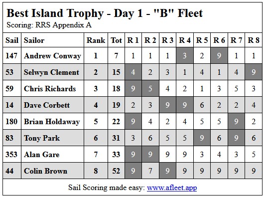 2025/26 Best Island Trophy Link to trophy information Day 1, Sun 16 Nov A Fleet Day 2, Sun 14 Dec B Fleet Day 1, Sun 16 Nov Day 2, Sun 14 Dec Home Sailing Calendar Sailing Handicaps Club Contacts Photo Gallery