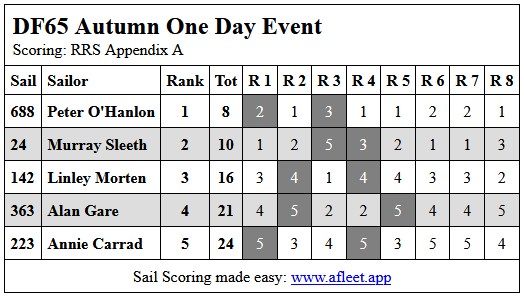 2025 DF65 Autumn One Day Event Link to trophy information. Sailed Sat 14 Jun Home Sailing Calendar Sailing Handicaps Club Contacts Photo Gallery
