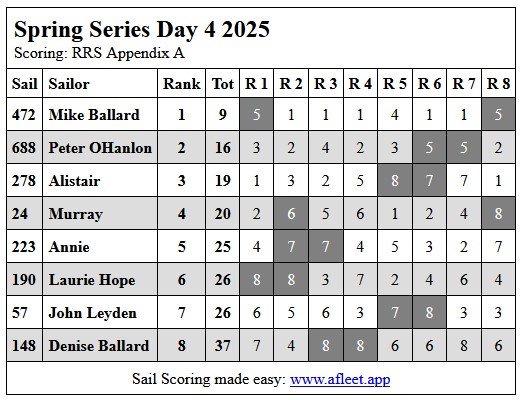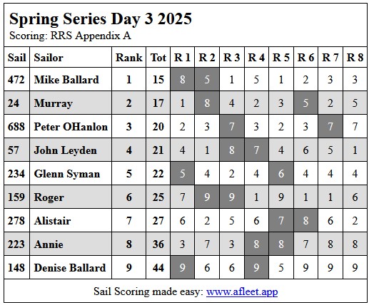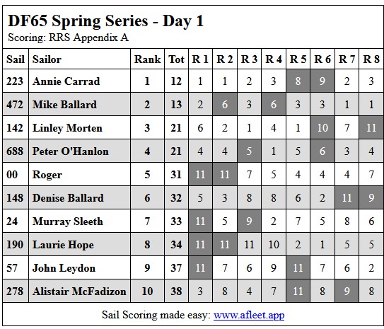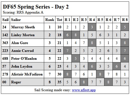 2025 DF65 Spring series Link to trophy information Day 1, Sat 20 Sep Day 2, Sat 27 Sep Day 3, Sat 18 Oct Day 4, Sat 25 Oct Home Sailing Calendar Sailing Handicaps Club Contacts Photo Gallery