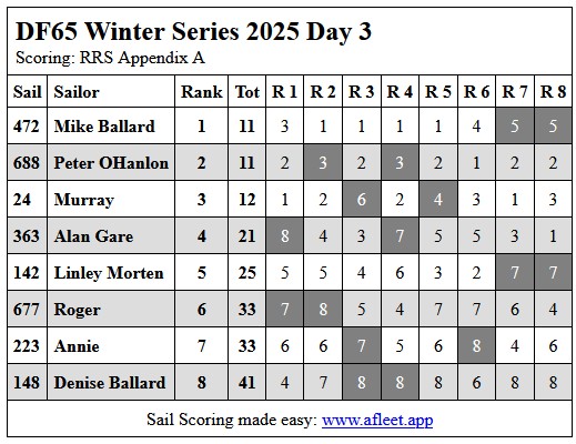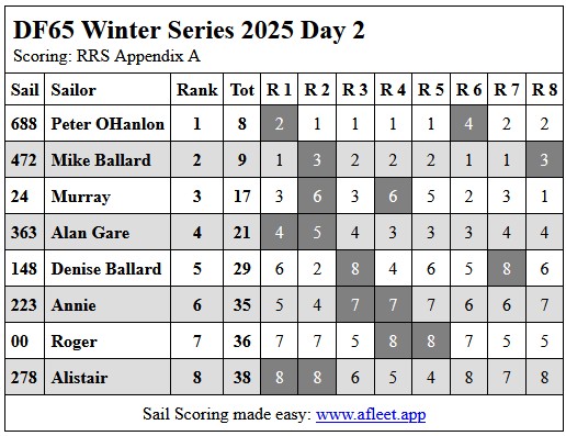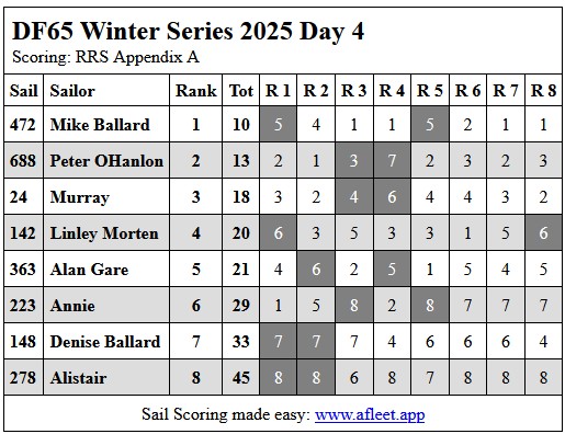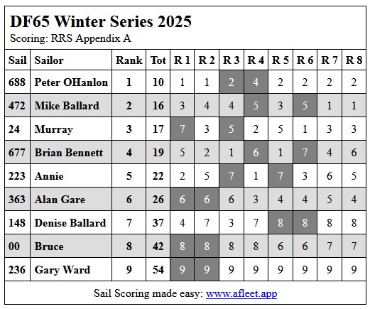 2025 DF65 Winter series Link to trophy information Day 1, Sat 5 July Day 2, Sat 12 July Day 3, Sat 19 Jul Day 4, Sat 26 Jul Home Sailing Calendar Sailing Handicaps Club Contacts Photo Gallery