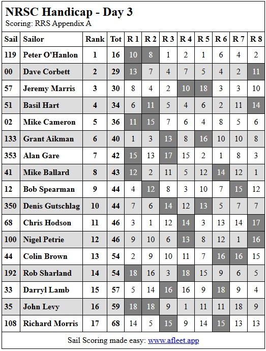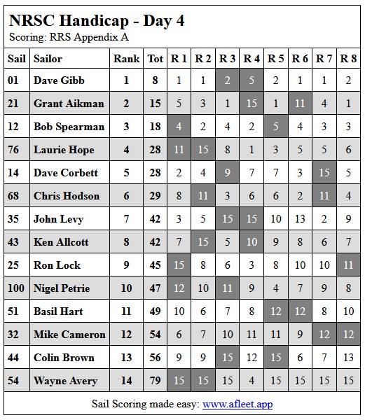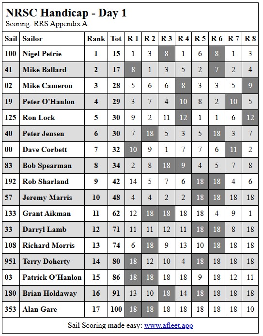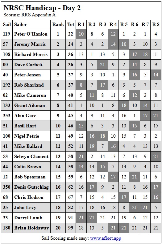 2025 NRSC Handicap Link to trophy information Race 1, Sun 19 Jan Race 2, Sun16 Mar Race 3, Sun 23 Mar Race 4, Sun 14 Sep Home Sailing Calendar Sailing Handicaps Club Contacts Photo Gallery