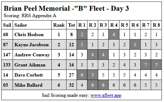 2026 Brian Peel Memorial. B Fleet Link to trophy information Day 1, Sun 15 Feb Day 2, Sun 22 Feb Day 3, Sun 22 Mar Home Sailing Calendar Sailing Handicaps Club Contacts Photo Gallery