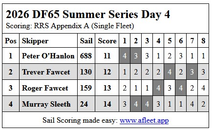 2026 DF65 Summer series Link to trophy information Race 1, Sat 31 Jan Race 2, Sat 7 Feb Race 3, Sat 14 Feb Day 4, Sat 11 Apr Home Sailing Calendar Sailing Handicaps Club Contacts Photo Gallery